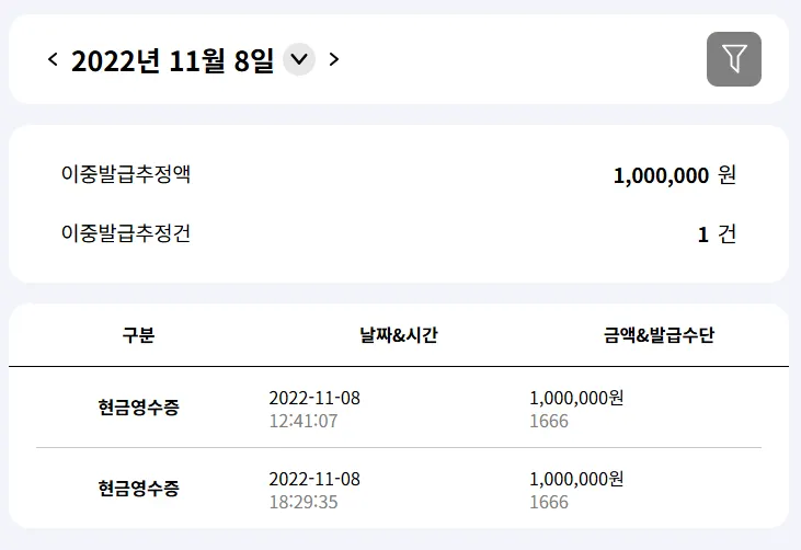매일 오전 7시에 업데이트 되는 현금영수증 중복발급 내역을 확인할 수 있습니다.