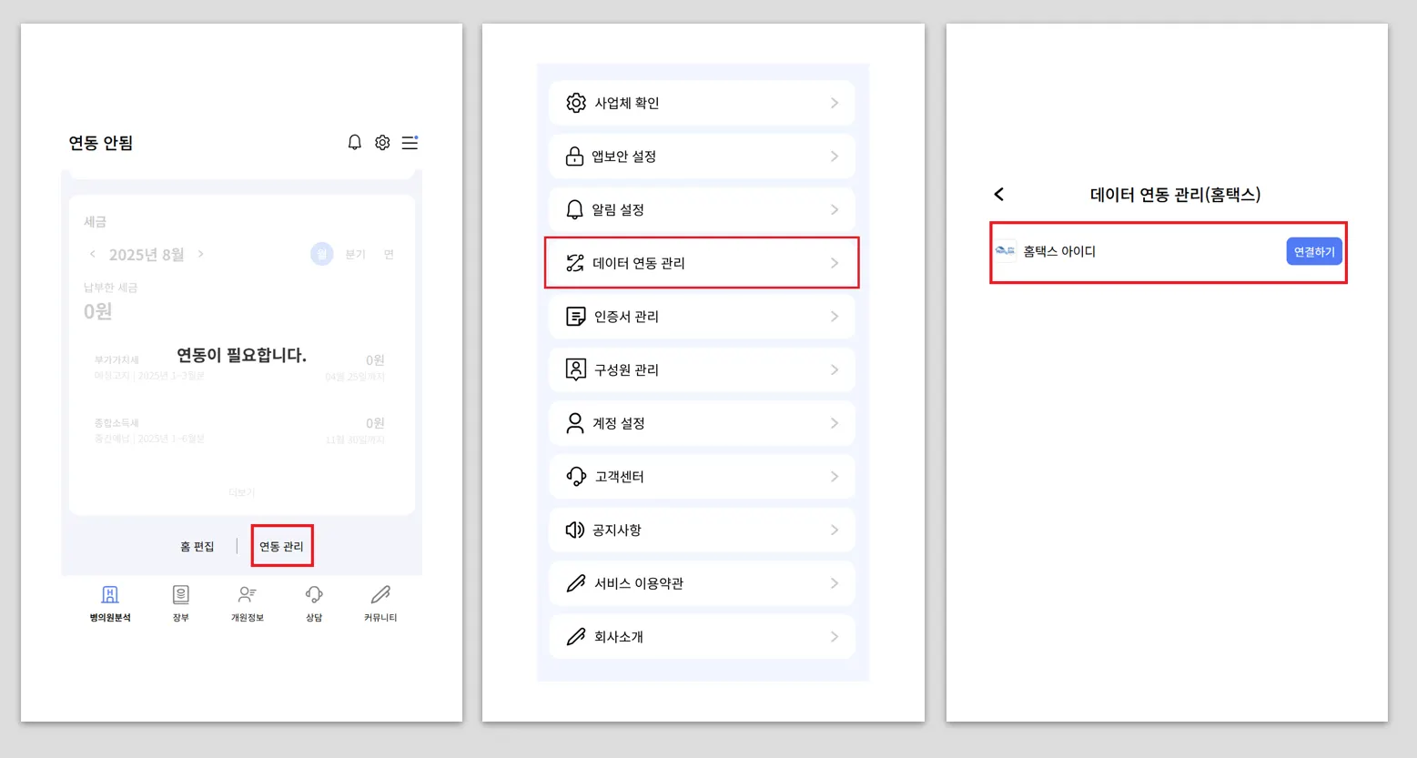 ‘설정 > 데이터 연동 관리 > 홈택스 아이디’