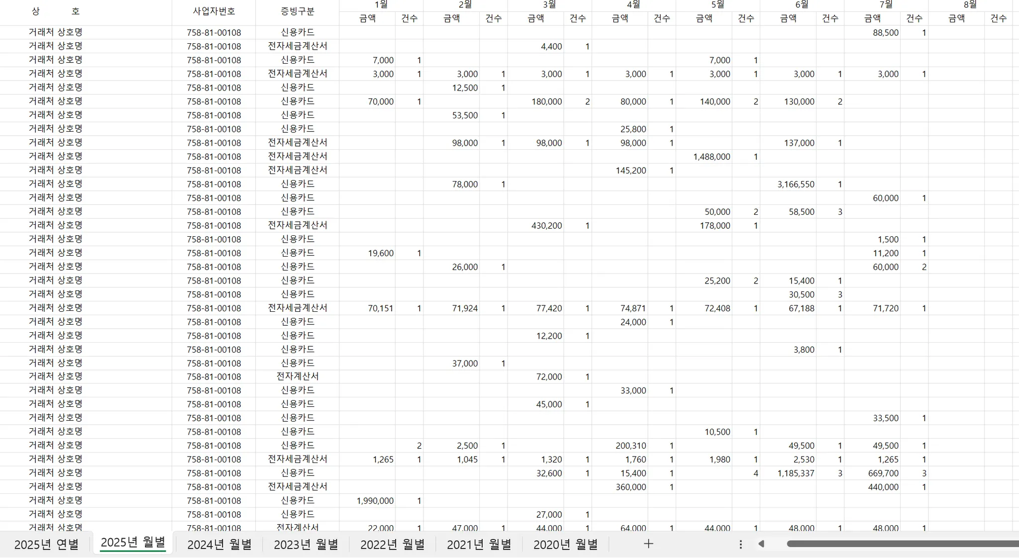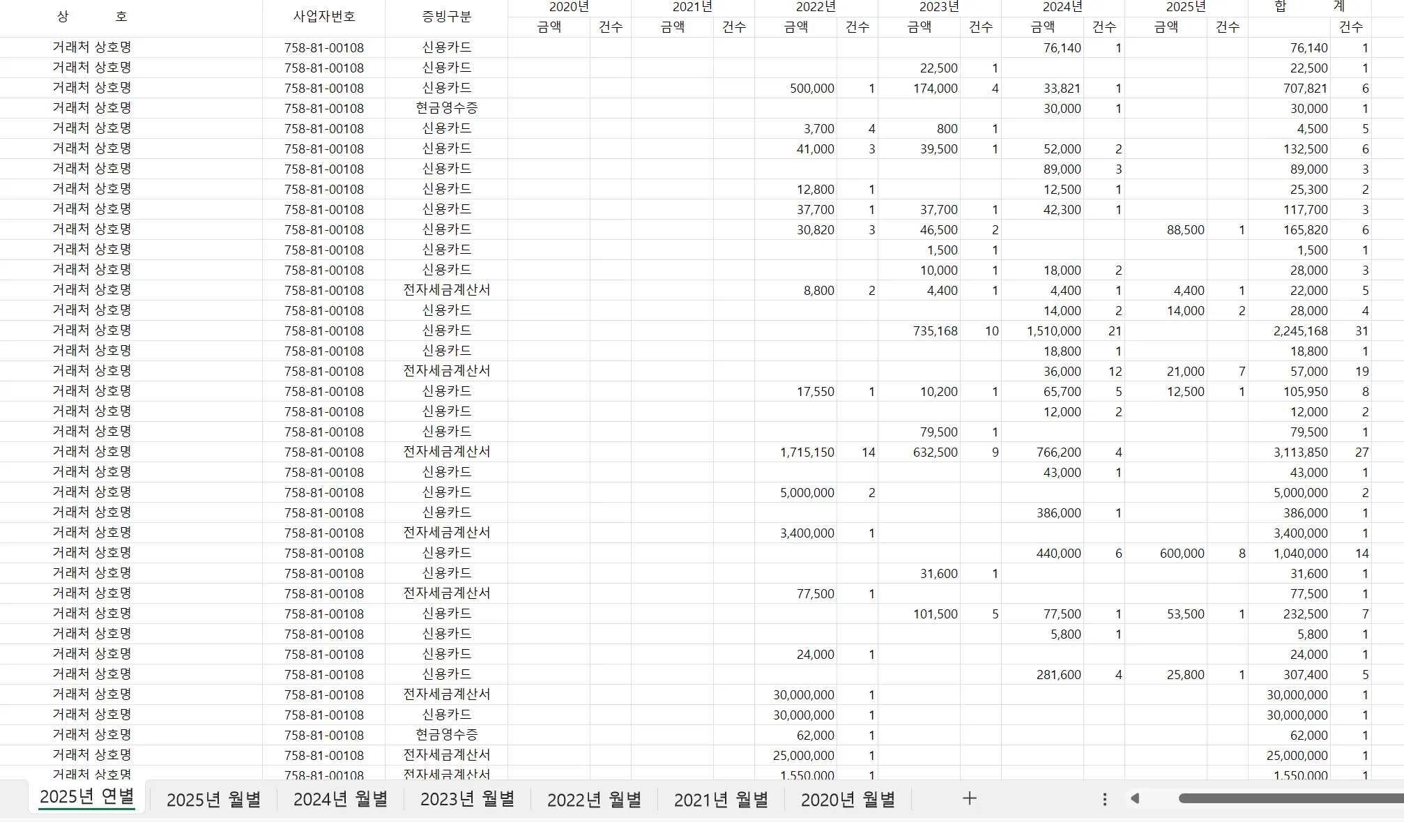 연별 시트를 선택하면 각 연도별, 거래처별로 구분된 지출금액과 발행건수를 한눈에 확인할 수 있습니다.