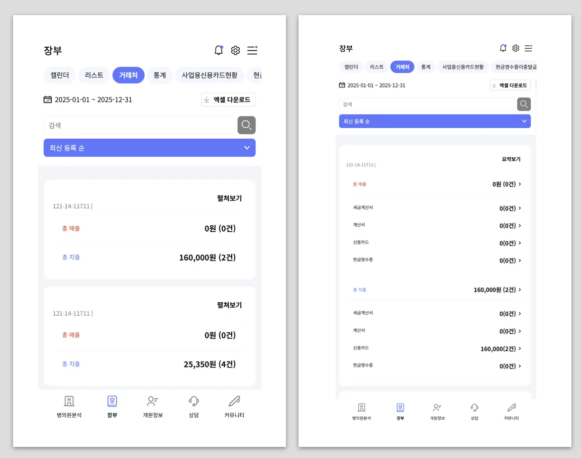 거래처별 병원 지출내역을 상세히 확인할 수 있습니다. 각 거래처에서 발생한 모든 지출 항목이 체계적으로 정리되어 있으며, 지출 금액과 결제 방식에 관한 정보도 함께 제공됩니다.