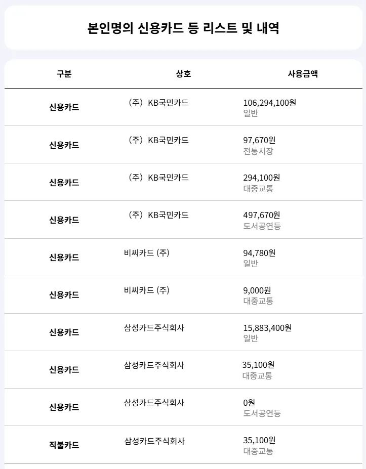 본인 명의 신용카드 등의 리스트와 상세 내역을 확인할 수 있습니다.
