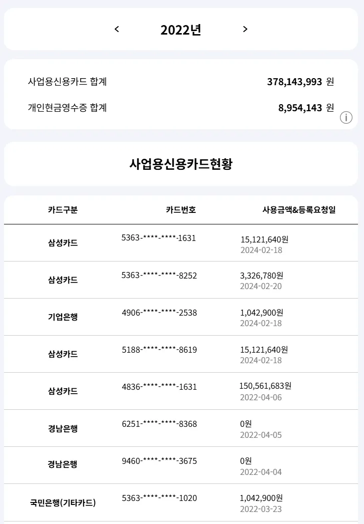 리스트에서 확인된 카드가 사업용 신용카드 현황에 조회되지 않는 경우 즉시 등록해주세요!
